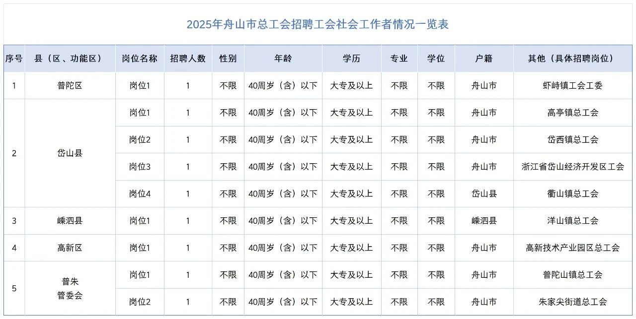 本次計劃招聘鄉(xiāng)鎮(zhèn)(街道、開發(fā)區(qū)、園區(qū))工會社會工作者9名,涉及 5個縣(區(qū)、功能區(qū)) 9 個鄉(xiāng)鎮(zhèn)(街道、開發(fā)區(qū)、園區(qū))。各招聘單位、崗位、人數(shù)、具體條件及其他情況詳見附件《2025年舟山市總工會招聘工會社會工作者情況一覽表》。